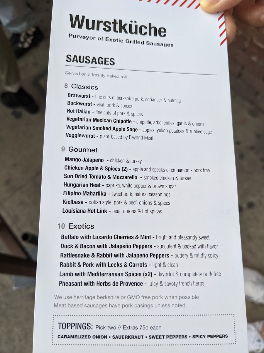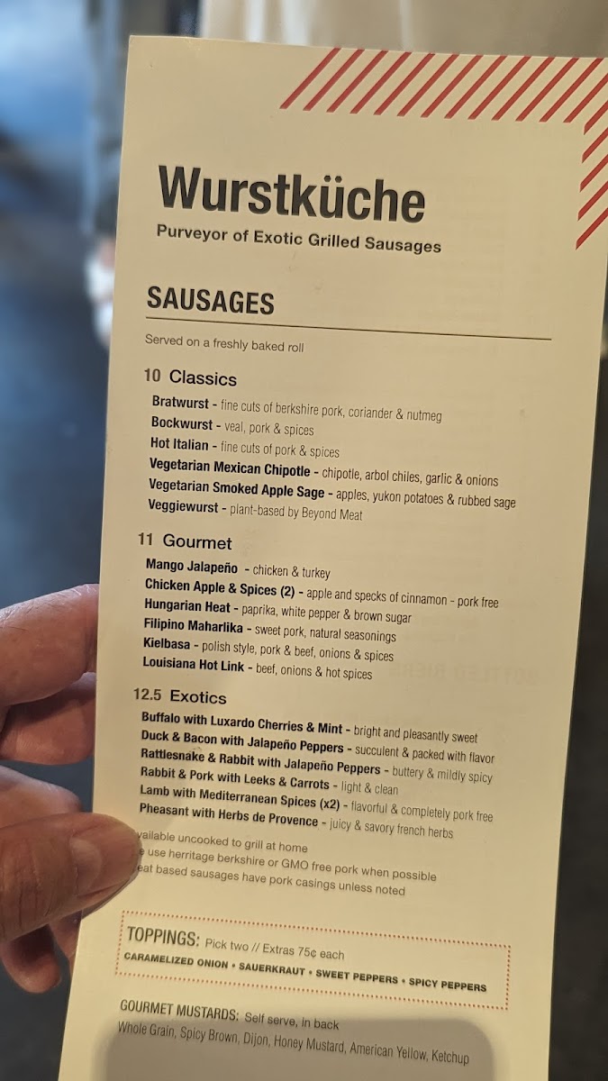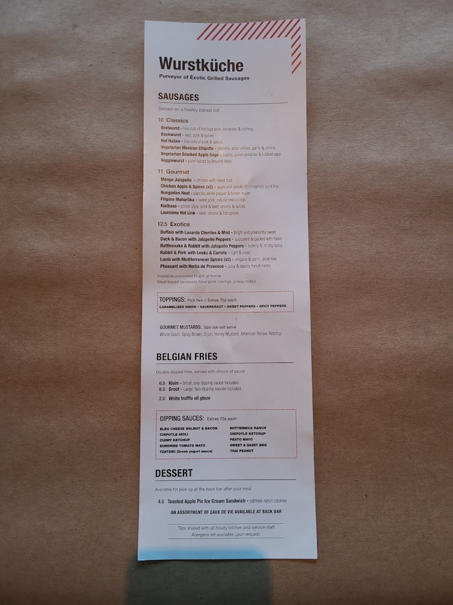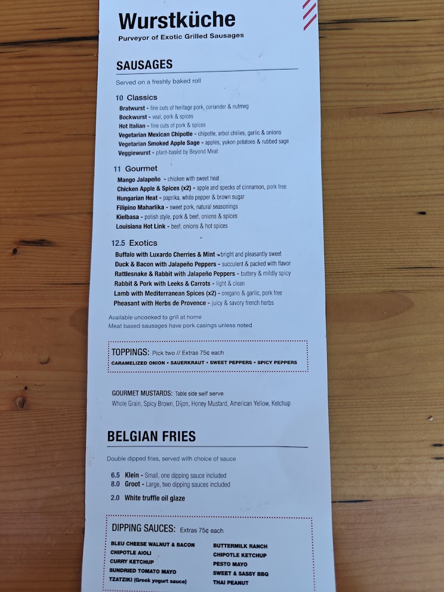 Wurstküche specializes in classic German cuisine, featuring an impressive selection of sausages that range from traditional bratwurst to more adventurous offerings like rattlesnake and rabbit. Customers rave about the quality and taste, with reviews highlighting the "great fries" and "awesome sausages." The regionally inspired menu is curated to provide a hearty and satisfying dining experience, and their fries are frequently described as some of the best around—perfectly crisped and ready to be dipped in a variety of flavors like the delicious sundried tomato mayo.